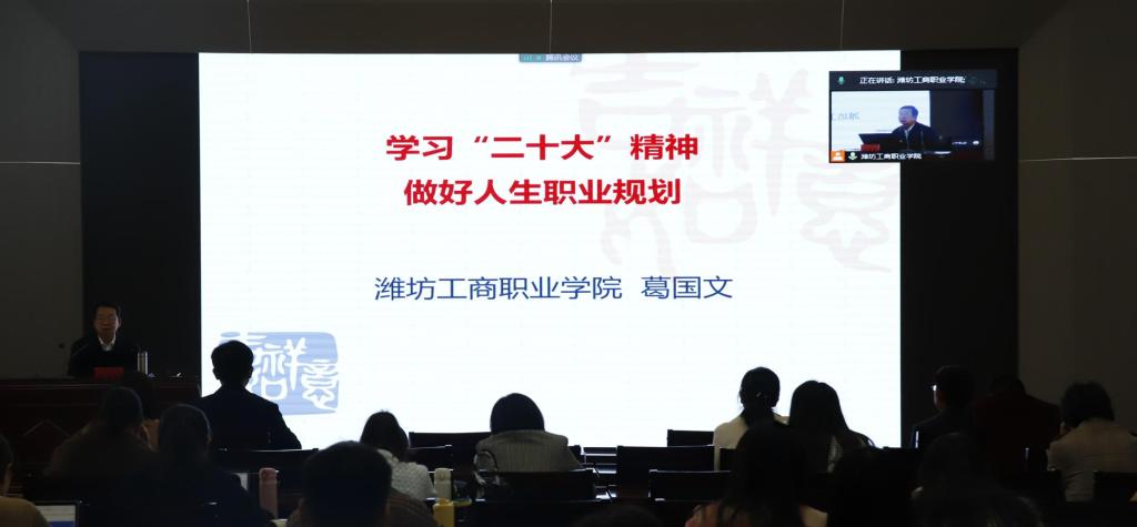 11月17日,潍坊工商职业学院举行党的二十大精神宣讲“党委书记第一讲”专题报告会。校党委书记葛国文作了题为《学习二十大精神 做好人生职业规划》的报告。报告会采取线上线下结合方式,执行校长、常务副书记郑志松等校领导,全体党支部书记、思政课教师、辅导员及学生代表现场听取了报告,其他师生通过线上形式收听收看。报告会由执行校长、常务副书记郑志松主持。